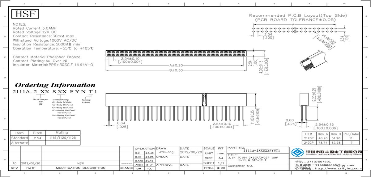 技術參數:額定電流:2.0amp電流電阻:20mΩ最大絕緣電阻:1000mΩ承受電壓:AC 500V /分鐘工作溫度:40﹣℃+ 105℃接觸材料:磷青銅接觸電鍍:對鎳金絕緣體材料:聚酯(UL94V-0)標準:PA6T或PBT黑色+ 30% GF