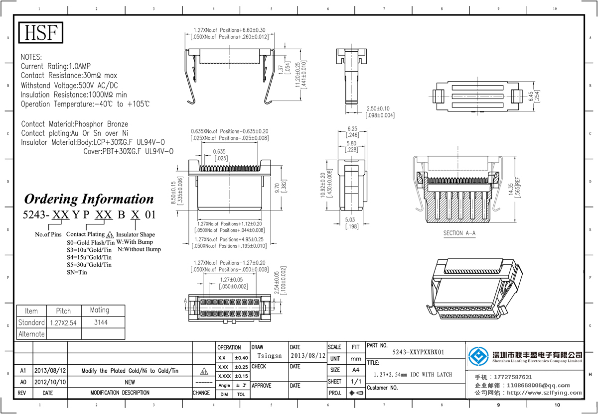 產(chǎn)品分類:IDC插座連接器 產(chǎn)品型號:1.27*2.54 TYCO 彈片型 IDC 聯(lián)豐盈 供應 技術(shù)參數(shù):額定電流:1.0amp電流電阻:20m最大絕緣電阻:1000mmin耐壓:1000V AC /分鐘工作溫度:40﹣℃+ 105℃接觸材
