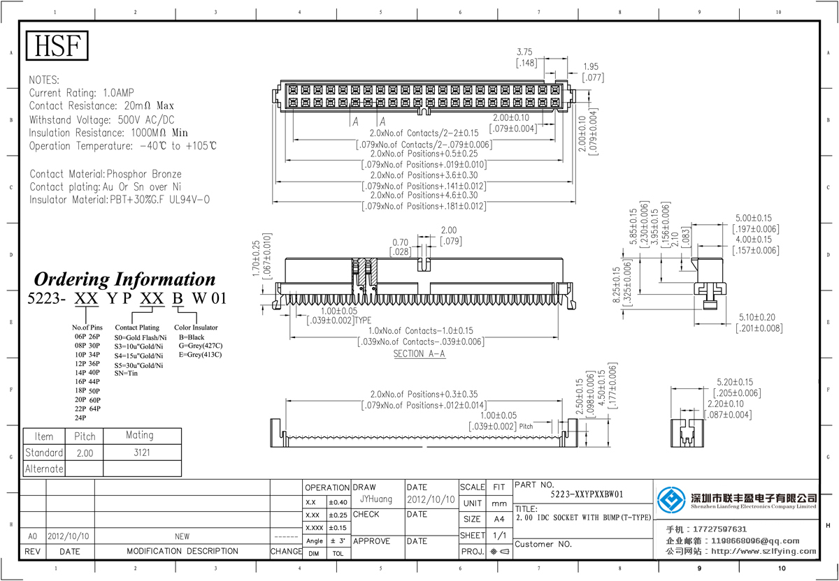 產品分類:IDC插座連接器 產品型號:2.0 TYCO 彈片型 帶凸點 IDC 聯豐盈 供應 技術參數:額定電流:1.0amp電流電阻:20m最大絕緣電阻:1000mmin耐壓:1000V AC /分鐘工作溫度:40﹣℃+ 105℃接觸