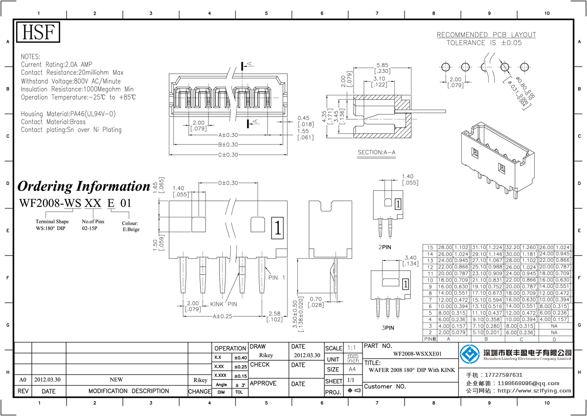技術參數:電流1.0amp:接觸電阻:20mΩ最大絕緣電阻:1000mΩmin耐壓:800V的交流電源/分鐘operyion溫度:25℃+ 85℃接觸材料:黃銅觸點電鍍金或錫鎳絕緣體材質:聚酯(UL94V-0)標準:PA66、PA46