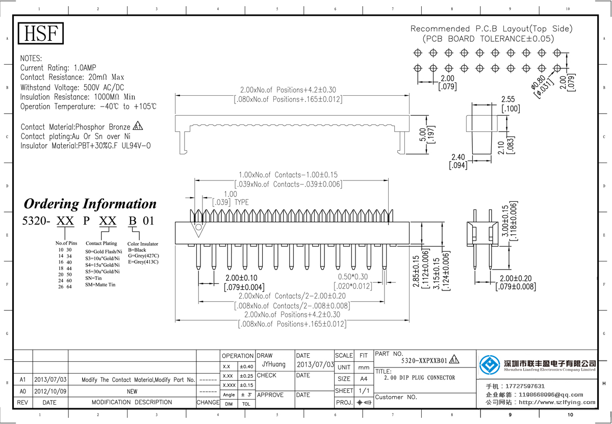 技術參數:額定電流:1.0amp電流電阻:30mΩ最大耐壓:1000V的交流/直流絕緣電阻:1000分鐘操作溫度:55﹣℃+ 105℃接觸材料:銅觸點電鍍金或錫鎳絕緣體材質:PBT的+ 30% g.f UL94V-O