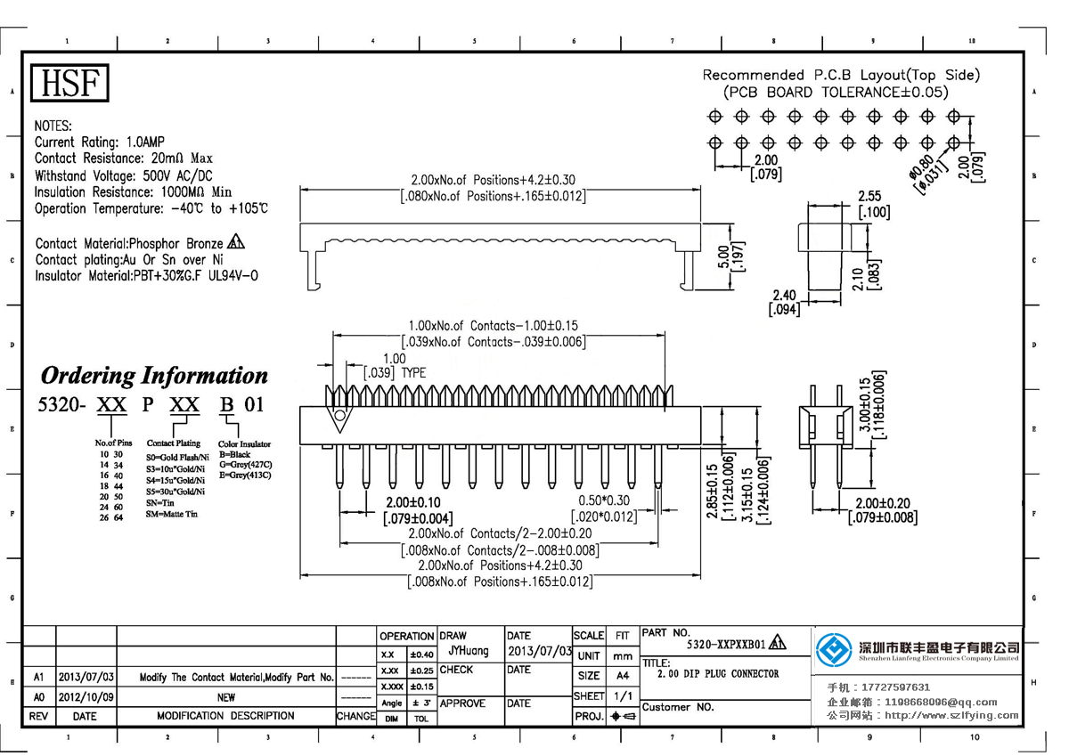產品分類:DIP插頭連接器 產品型號:生產 聯(lián)豐盈 2.0MM 磷銅 亮錫 DIP PLUG 技術參數(shù):額定電流:1.0amp電流電阻:20m最大絕緣電阻:1000mmin耐壓:1000V AC /分鐘工作溫度:40﹣℃+ 105℃接觸材