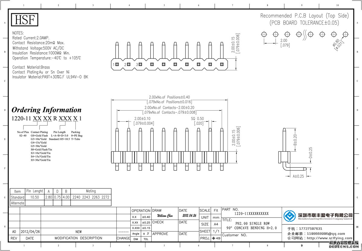 產品分類:排針連接器 產品規格:聯豐盈 2.0MM 單排 90DIP 排針 廠家 產品介紹:額定電流:2.0amp電流電阻:20m最大絕緣電阻:1000m民承受電壓:AC 500V /分鐘工作溫度:40﹣℃+ 105℃接觸材
