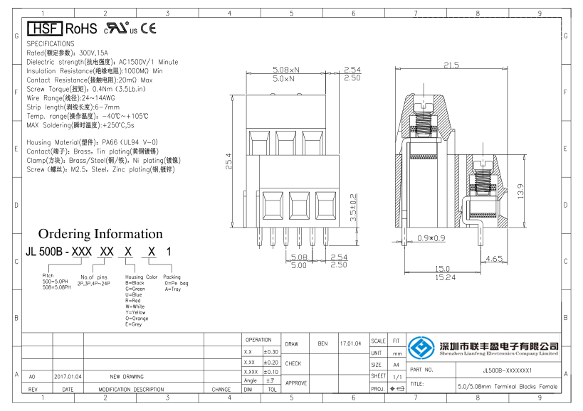 詳細型號:螺釘式PCB接線端子-JL500B,間距5.00/5.08mm,CE認證,UL證書