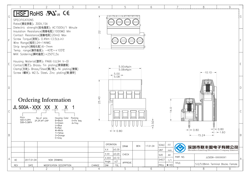 詳細型號:螺釘式PCB接線端子-JL500A,間距5.00/5.08mm,CE認證,UL證書
