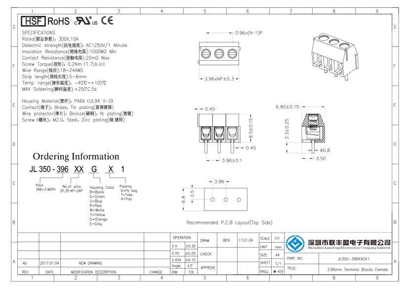 詳細型號:螺釘式PCB接線端子-JL350,間距3.50/3.96mm,CE認證,UL證書