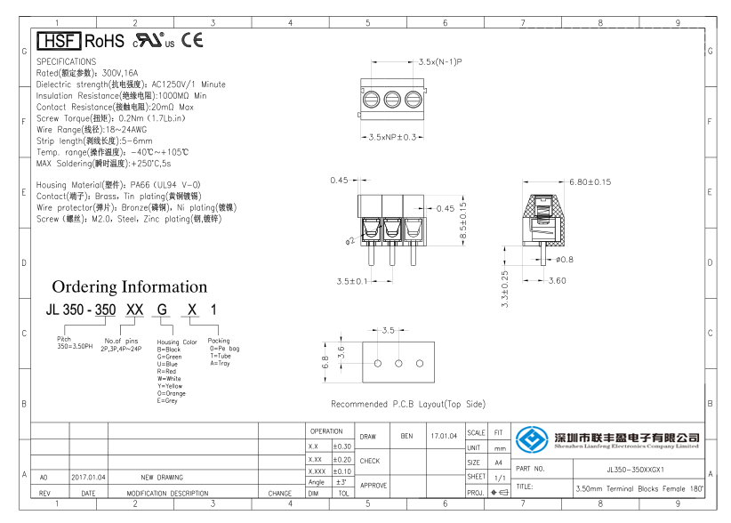 產品分類:接線端子 產品型號:螺釘式PCB接線端子 間距3.50/3.96mm 詳細型號:螺釘式PCB接線端子-JL350,間距3.50/3.96mm,CE認證,UL證書 產品介紹:材質電鍍(MATERIAL) , 螺絲(Screw)M2.0,鋼,