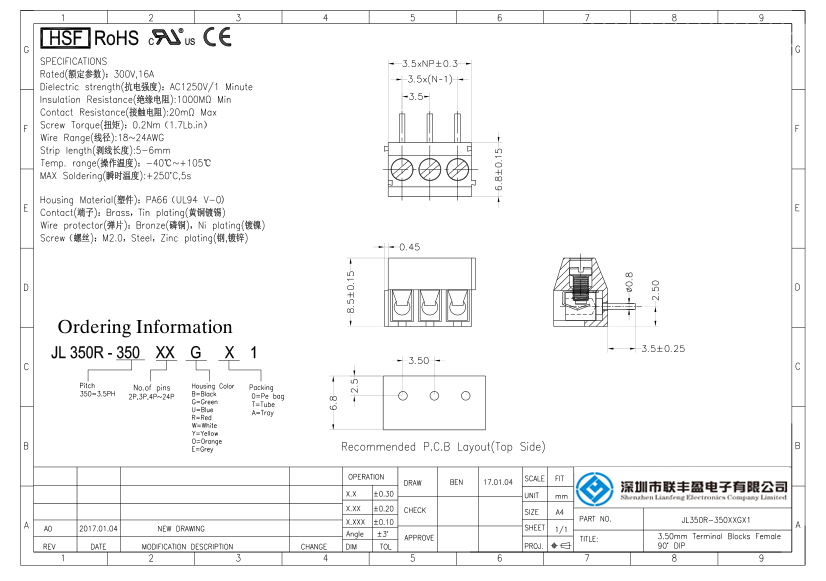 詳細(xì)型號(hào):螺釘式PCB接線端子-JL350R,間距3.50/3.96mm,CE認(rèn)證,UL證書(shū)