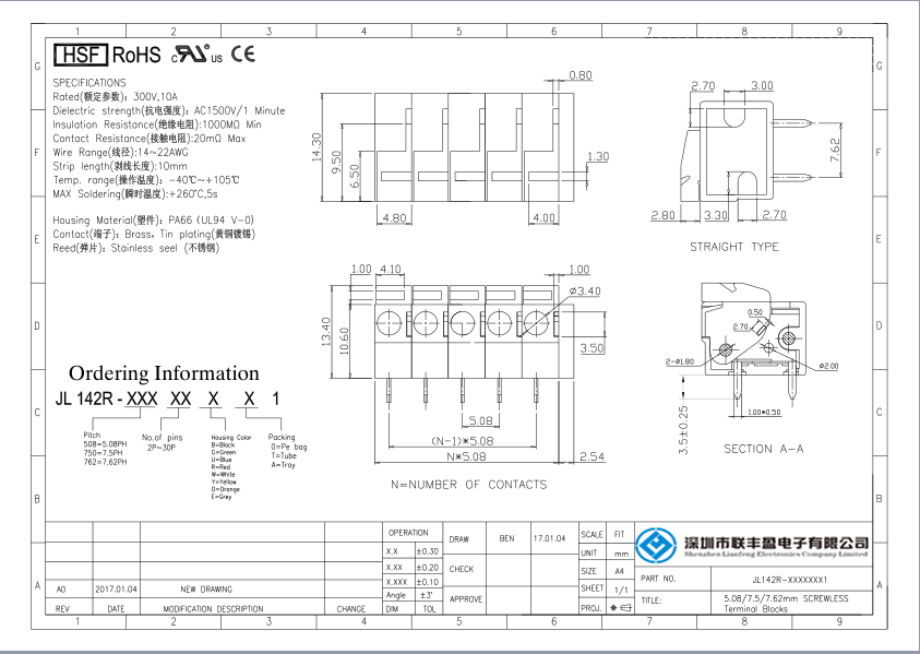 產品型號:彈簧式PCB接線端子-JL142R,間距5.08/7.5/7.62mm,CE認證,UL證書