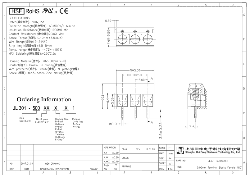 產品分類:接線端子 產品型號:螺釘式PCB接線端子 間距5.00mm 詳細型號:螺釘式PCB接線端子-JL301,間距5.00mm,CE認證,UL證書 產品介紹:材質電鍍(MATERIAL) , 螺絲(Screw)M2.0,鋼,鍍鋅