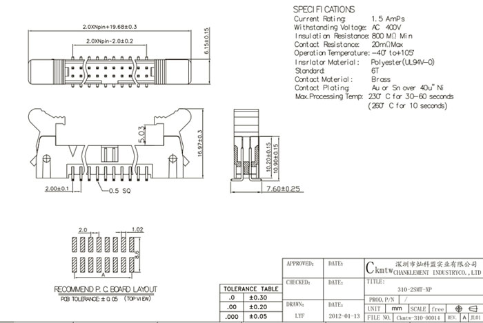 產(chǎn)品類型: 牛角連接器 產(chǎn)品名稱 310-2SMT-XP 間 距 2.0mm 裝配類型 SMT PIN 針數(shù) 6P、8P、10P、12P、14P、16P、20P、24P、26P、30P、34P、40P、44P、50P、60P、64P 額定電流 1.5A AC/DC 最大耐壓 AC 500V 工作