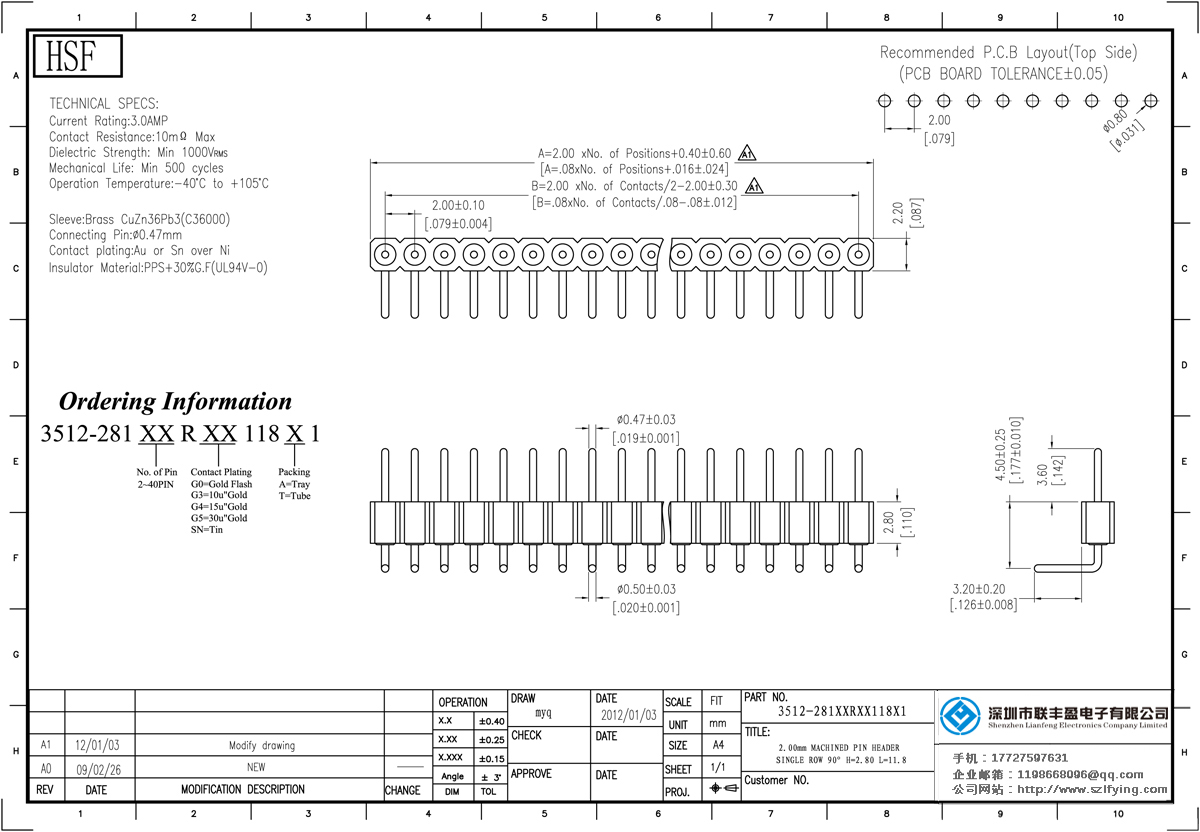 產(chǎn)品分類(lèi):圓孔排針排母連接器 產(chǎn)品型號(hào):聯(lián)豐盈 2.0MM 單排 H=2.8 S/T 圓型排針 技術(shù)參數(shù):3.oamp接觸電阻:10mMax Dielectric強(qiáng)度:MIN1000vrms機(jī)械壽命:500分鐘周期運(yùn)行溫度:40℃+ 105℃套:黃