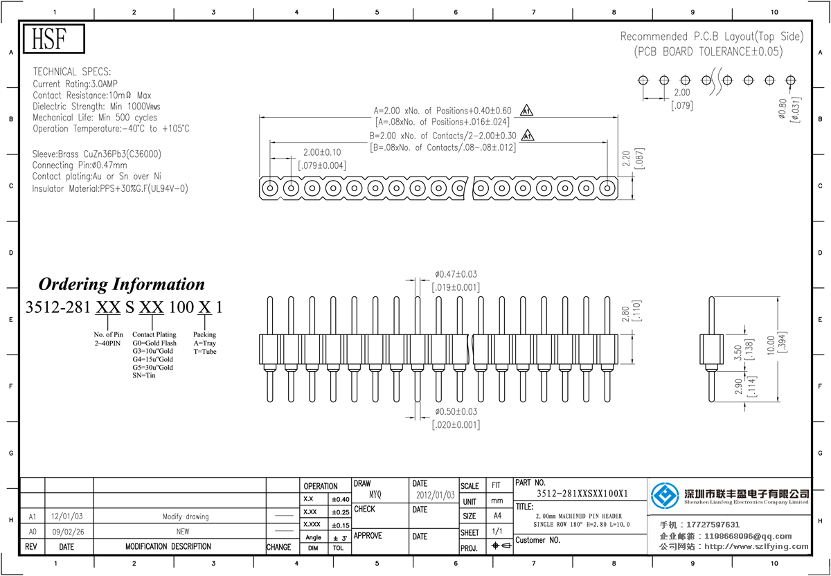 產(chǎn)品分類:圓孔排針排母連接器 產(chǎn)品型號:聯(lián)豐盈 2.0MM 單排 H=2.8 S/T 圓型排針 技術參數(shù):額定電流:3.oamp接觸電阻:1om最大介電強度:MIN 1000vrms機械壽命:最少500次交配引腳:0.400.66m