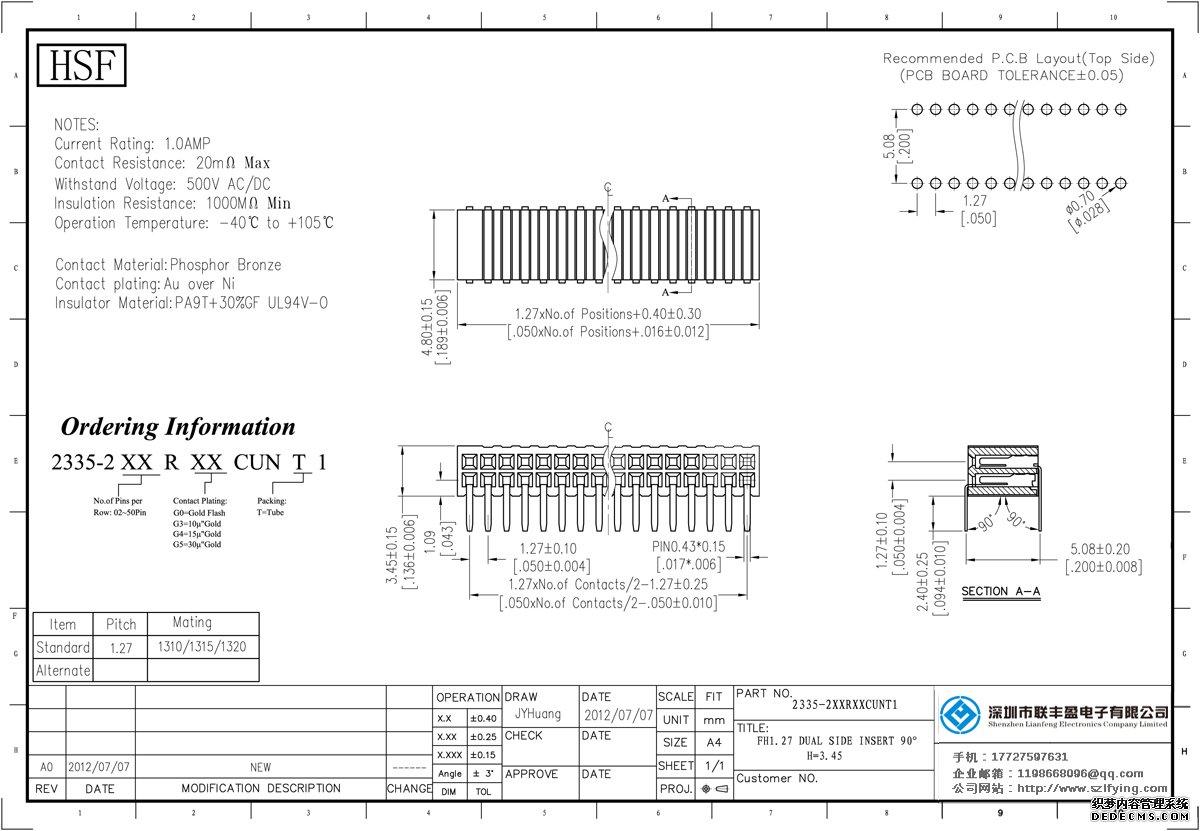 產品分類:排母連接器 產品規格:聯豐盈 1.27MM 雙排 180度SMT 側插型 排母 H=3.5 產品介紹:額定電流:1.0amp電流電阻:20m最大絕緣電阻:1000m民承受電壓:AC 500V /分鐘工作溫度:55﹣℃+