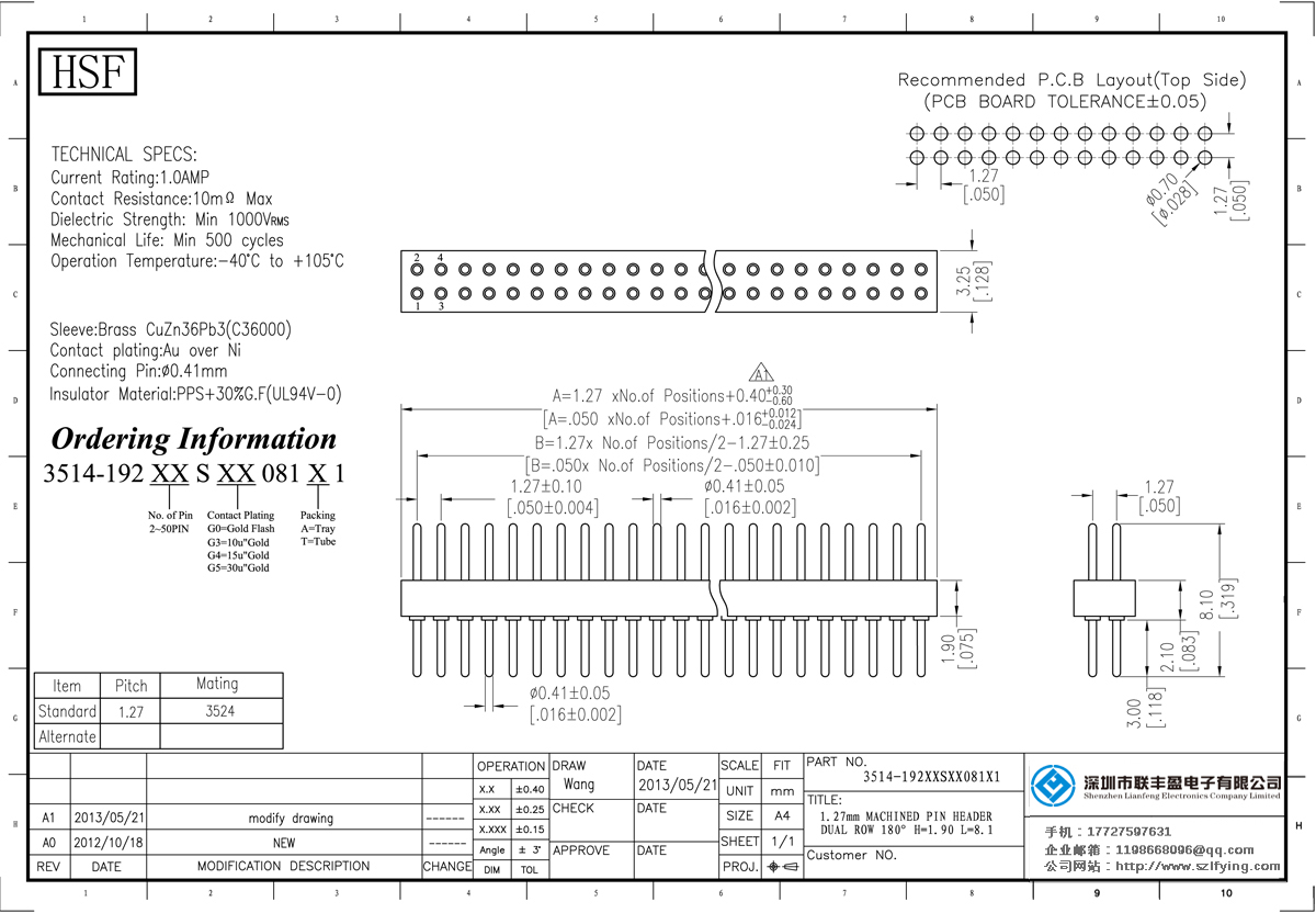 技術參數:額定電流:1.0amp接觸電阻:10mΩ0 Max Dielectric強度:MIN 500vrm5機械壽命:最少500次交配銷:φ0.38φ0.50mm力量:(拋光不銹鋼表φ0.41mm)lnsertion:150g最大/銷,退出:30g分鐘/針的操作溫度:- 40 + 105℃℃袖長:黃銅cuzn36pb3(c36000)、錫鎳接觸夾(6指):BeCu(C17200)。