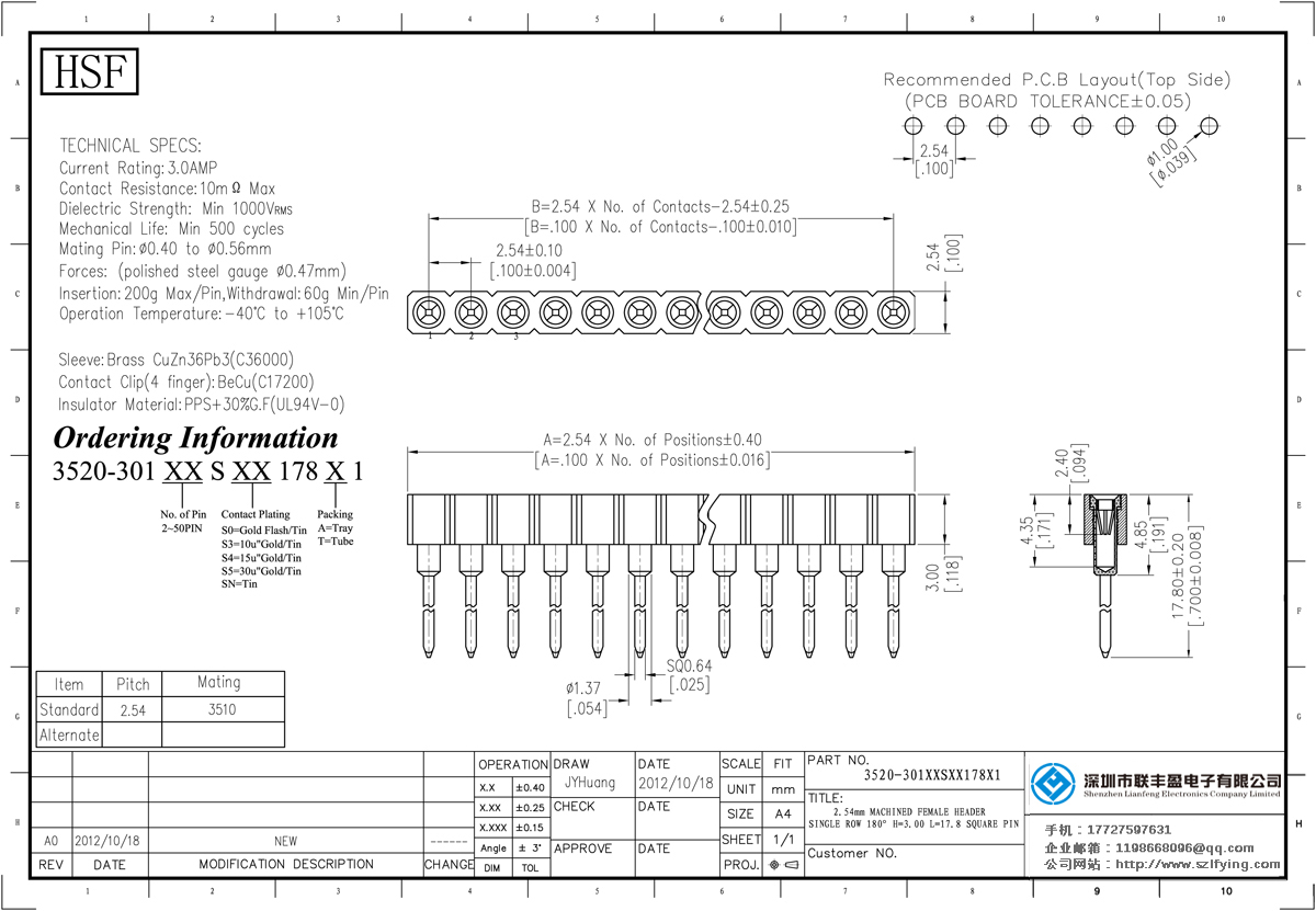 產(chǎn)品分類:圓孔排針排母連接器 產(chǎn)品型號:聯(lián)豐盈 2.54MM 單排 H=3.0 S/T 圓孔排母 技術(shù)參數(shù):額定電流:3.oamp接觸電阻:1om最大介電強度:MIN 1000vrms機械壽命:最少500次交配引腳:0.70.9mm或