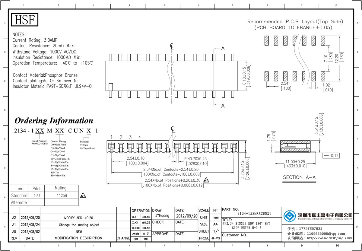 產品分類:排母連接器 產品規格:聯豐盈 2.54MM 單排 180 SMT 排母 產品介紹:額定電流:3.0amp電流電阻:20m最大絕緣電阻:1000mmin耐壓:1000V AC /分鐘工作溫度:40﹣℃+ 105℃接觸材料:磷