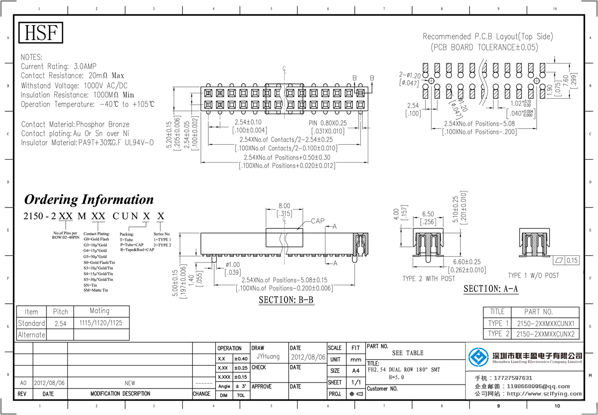 產品分類:排母連接器 產品規格:聯豐盈 2.54MM H=5.0MM 雙排 180 SMT 排母 直銷 產品介紹:額定電流:3.0amp電流電阻:20m最大絕緣電阻:1000mmin耐壓:1000V AC /分鐘工作溫度:40﹣℃+ 105℃接
