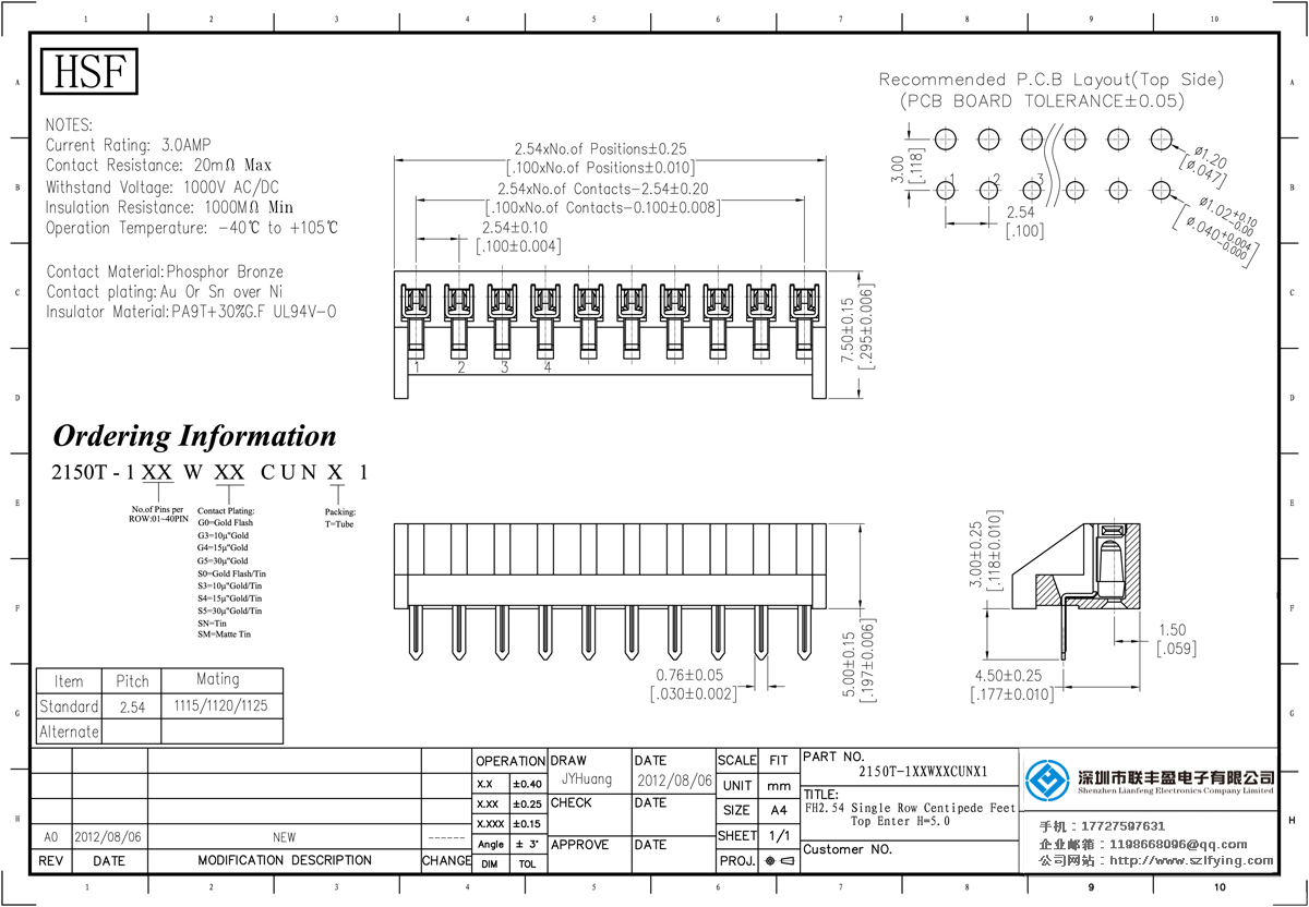 產品分類:排母連接器 產品規格:聯豐盈 耐高溫 2.54MM H=5.0MM 上插式 單排 排母 產品介紹:額定電流:3.0amp電流電阻:20m最大絕緣電阻:1000mmin耐壓:1000V AC /分鐘工作溫度:40﹣℃+ 10