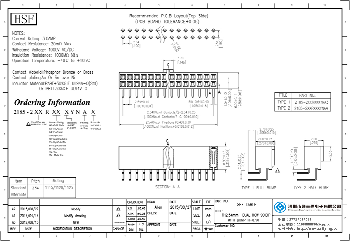 產品分類:排母連接器 產品規格:2.54MM H=8.5MM 帶凸點 雙排 90彎插型 排母 產品介紹:額定電流:3.0amp電流電阻:20m最大絕緣電阻:1000mmin耐壓:1000V AC /分鐘工作溫度:40﹣℃+ 105℃接觸