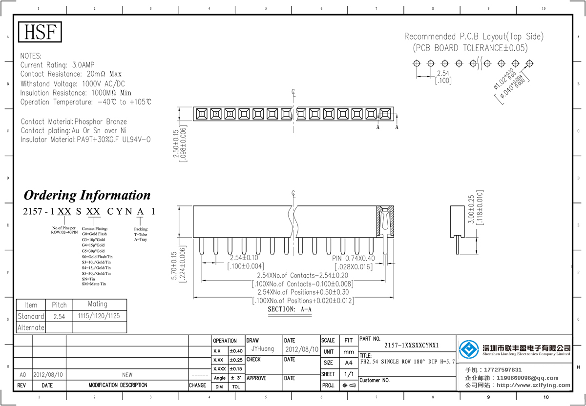 產品分類:排母連接器 產品規格:2.54mm 母頭、單排、直腳 產品介紹:電流評級:3.0amp電流電阻:20m最大絕緣電阻值:1000m耐受電壓1000V AC /分鐘:分鐘操作溫度:﹣40℃to + 105℃:磷青銅