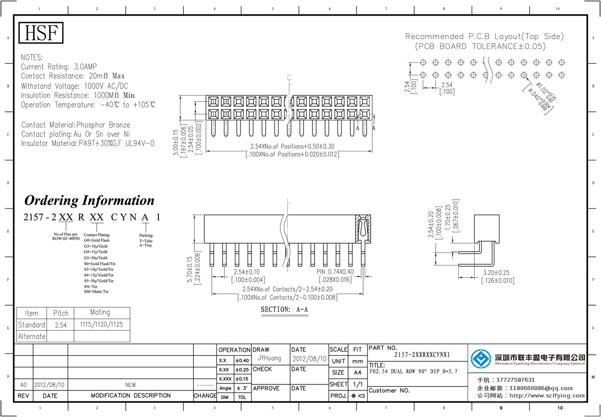 產品介紹:2157 - 2xxrxxcynx1電流評級:3.0amp電流電阻:20mΩ最大絕緣電阻值:1000mΩ耐受電壓1000V AC /分鐘:分鐘操作溫度:﹣40℃to + 105℃:磷青銅鍍金接觸材料接觸:在金或錫在絕緣體材料:聚酯(UL94V - O)標準:黑色+ PA6T 9T金30%