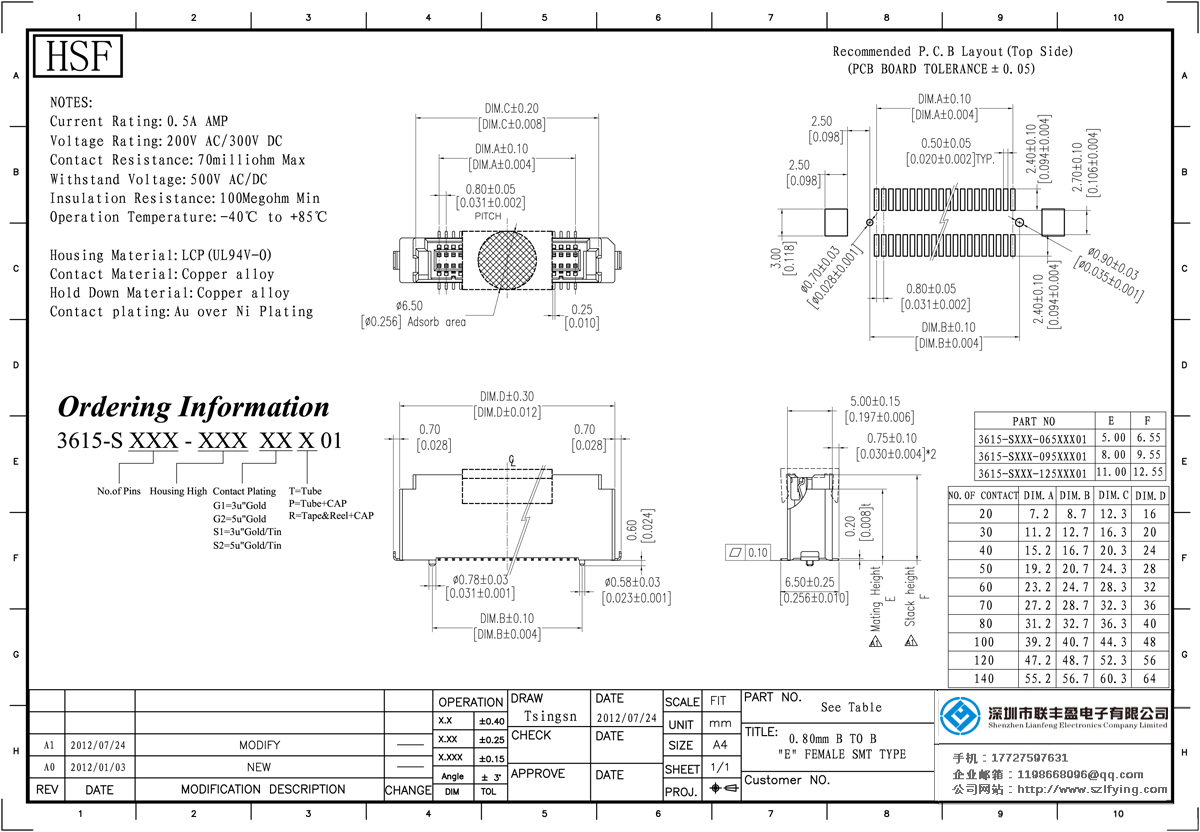 產品分類:Board To Board 連接器 產品型號:聯豐盈 辦公設備 0.8MM 母座 卷裝 Board To Board 技術參數:額定電流:0.5amp電流電阻:30m最大絕緣電阻:100m承受電壓:AC 500V /分鐘工作溫度:40﹣