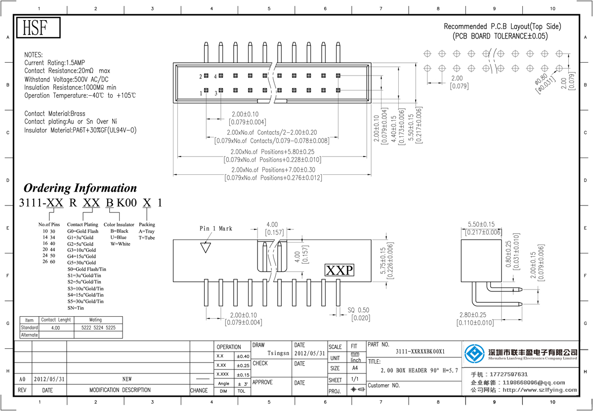 技術參數:額定電流:2.0amp電流電阻:20mΩ最大承受電壓:500V的交流/直流絕緣電阻:1000分鐘操作溫度:40﹣℃+ 105℃接觸材料:銅觸點電鍍金或錫鎳絕緣體材質:PBT的+ 30% g.f UL94V-O蓋ul-94v-o LCP;